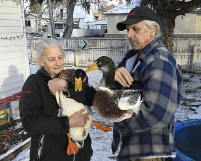 Joe Manio Lethbridge Herald Local Journalism Initiative Reporter Life is ducky once again for pet ducks Chasey and Chicken after running “afowl” of the law. The pair were in danger of being evicted from their home on the corner of 12 Street and 6 Avenue North where they live with retirees Laurel and Mitch VanDyk.