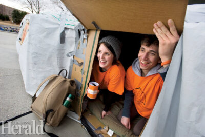 Herald file photo by Ian Martens Students Diana Adamo and Dominic Fode look out from their cardboard, tape and tarp shelter during a past 5 Days for the Homeless initiative at the University of Lethbridge. Held by the Management Students' Society, students spend five full days living in their homemade shelter and eating only donated food, all in an effort to increase awareness for local youth homelessness and to help raise funds for Woods Homes.