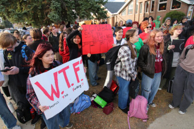 Lethbridge Collegiate Institute (LCI) students gather across the street at the First Baptist Church after walking out of class Monday morning, in protest of Bill 2 Back to School Act ending the Alberta teachers strike and forcing them back to worki.Alexandra Noad
