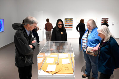 ApiÕsoomaahka (Running Coyote) speaks with visitors gathered around him during the opening of (Re)mediating Soils: Field Notes at the University of Lethbridge Art Gallery on Friday.By Joe Manio