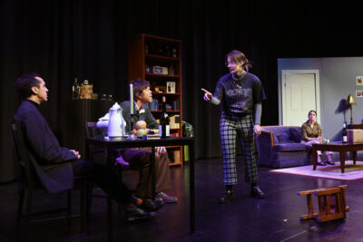 HERALD PHOTO BY JOE MANIO Aby Spencer as Eve continues her haunting “ghost story,” gesturing toward Jason Lisburn (Robert) as he sits with Jordan Bond (David) at the table, while Robin Kalau (Sam) listens from the sofa in the background during Burn by Canadian playwright John Muggleton.By Joe Manio