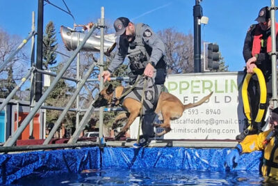 Macho hesitated at the edge despite his partner repeatedly throwing Macho’s favorite toy into the tank. Finally, the K9 was finally given a gentle “assist” into the icy drink. Many commented Macho was the “smart one” and Mayor Hyggen praised Macho and the other PSDs in LPS.