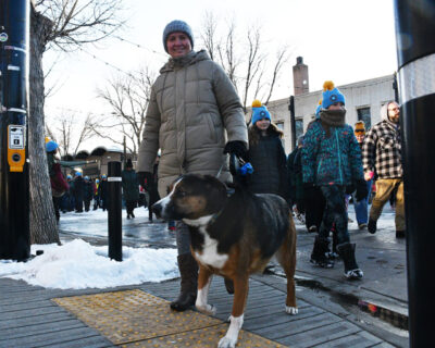 With temperatures hovering between -2°C and -3°C under passing clouds, and a steady 19 km/h wind pushing the wind chill closer to -7°C or -8°C, nearly 200 people and one family dog gathered at Festival Square in downtown Lethbridge Saturday and chose to step into the cold.