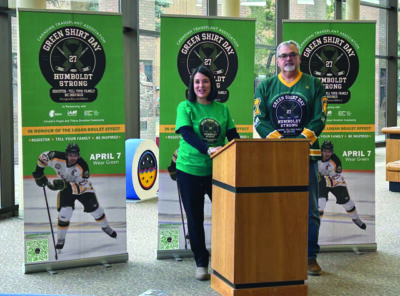 With Green Shirt Day quickly approaching, Toby and Bernadine Boulet released this year’s shirt logo during a ceremony at City Hall Tuesday morning, a day after what would have been their son Logan’s 29th birthday.