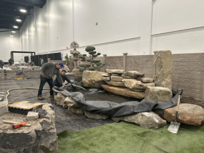 Southern Alberta Rock Gardens and Landscaping LTD. staff fill up a small pond on display for visitors to enjoy at the Home, Garden & Leisure Show Tuesday at the Lethbridge Trade & Convention Centre.By Alejandra Pulido-Guzman