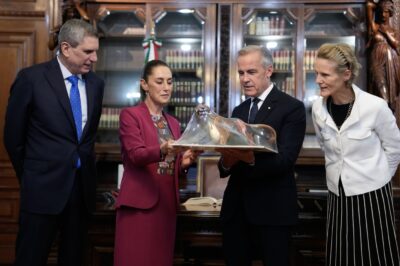 “We are totally aligned in our excitement, enthusiasm for the beautiful game and co-hosting in a sign of friendship,” Carney told Sheinbaum after she presented him with the ball.