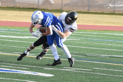 Herald Photo by Justin Seward Catholic Central Cougars Easton Compton is dragged down by Lachlan Fletcher of the Chinook Coyotes during School Sport Alberta South Zone Final football action at University of Lethbridge Community Sports Stadium on Saturday.