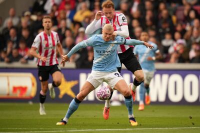 Haaland muscled his way through Brentford’s defense and drilled a low shot into the net for the early goal in City’s 1-0 victory.