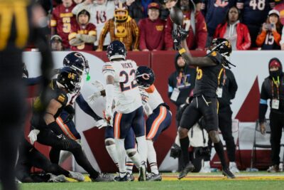 A refresher: Chicago led 15-12 after a TD run with 25 seconds remaining. That was down to 19 seconds after the ensuing kickoff return put Washington at its own 24-yard line with zero timeouts left. Completions by Daniels, playing with a rib injury, to Zach Ertz and Terry McLaurin moved the ball to Washington’s 48 with just two seconds to go.
