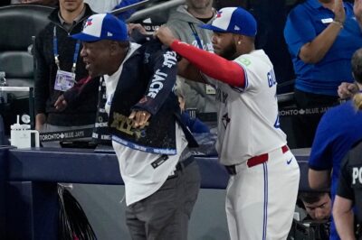 As Carter walked off the field, Vladimir Guerrero Jr. stepped forward to offer him the blue blazer that Blue Jays players put on to celebrate home runs, a Toronto tradition since 2021.