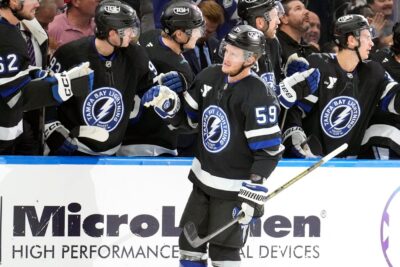 Guentzel put the Lightning in front with a power-play goal when Victor Hedman’s point shot deflected off his shin pad at 15:09.