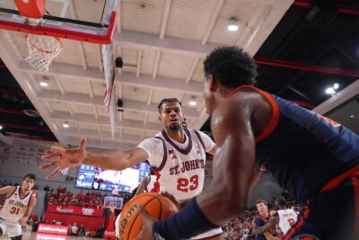 St. John’s trailed by four midway through the first half but took an 11-point lead on a 3-pointer by Prey with 4:02 left. The Red Storm ended the half with a 18-5 run for a 41-25 lead.