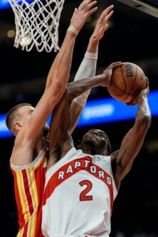 He suited up for Toronto again later Friday, playing nearly four minutes in garbage time of the Raptors’ 111-86 loss to Charlotte, his third professional basketball game in a 24-hour span.