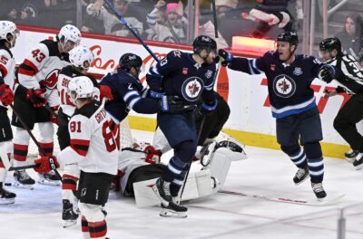 New Jersey defenceman Jonas Siegenthaler’s shot went in just under a minute later, but the Jets successfully challenged for goaltender interference because Paul Cotter had bumped into Hellebuyck.