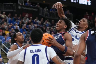 The Huskies nearly squandered an 18-point lead — 42-24 — with 17:20 left to play. Seton Hall battled back and closed within a point at 65-64 on a 3-pointer by Mike Williams III with 48 seconds left.