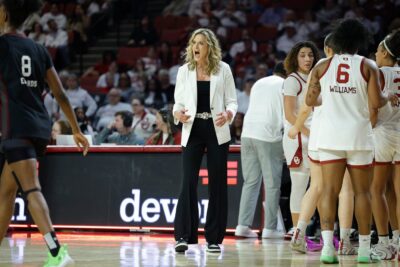 Oklahoma’s Kaya Smith fouled Ta’Niya Latson on a 3-pointer with 0.4 seconds left in the first half, and Latson made all three free throws to give the Gamecocks a 43-36 lead at the break.