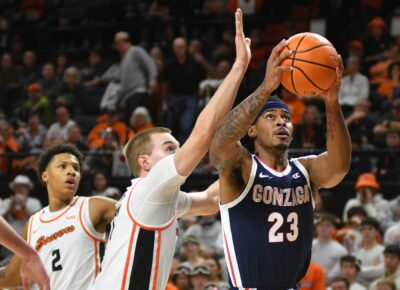 Oregon State held a narrow lead though the first 10 minutes, but Ike’s 3-pointer gave Gonzaga a 22-20 lead and the Bulldogs led until White’s 2-pointer pulled the Beavers even at 34.